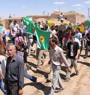 Belediye ait resmi plakalı cenaze aracına sözde PKK bayrağı asıldı. Suruç’ta yaklaşık 500 kişilik grup, terörist başı Abdullah Öcalan’ın posterlerini taşıdı, "Dişe diş kana kan", "Yaşasın Apo" ve Suruç Ovası Apo’nun yuvası" sloganları attı. Kent merkezinde yürüyüş yapan grup, daha sonra Çaykara köyüne hareket etti.