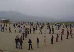 Şehir Stadyumu'nun yakınındaki toprak sahada toplanan öğrenciler, elektrik ve gereken araçlar bulunmadığı için provalarını müziksiz yapmak zorunda kalıyorlar.