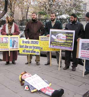 Mazlum-Der Ankara Şubesi, ABD’nin Irak’ı işgalini ABD’nin Ankara Büyükelçiliği’ne kanlı bebek maketi bırakarak protesto etti.