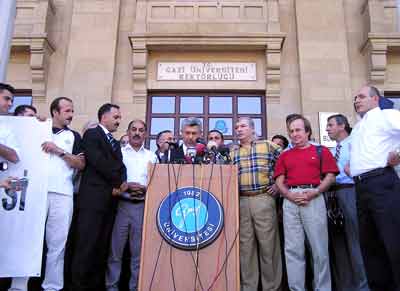 Cumhurbaşkanı Ahmet Necdet Sezer tarafından 22 üniversite rektöründen 5'inin veto edilmesi sonrasında Gazi Üniversitesi Rektörü Rıza Ayhan, rektörlük binası önünde bir basın açıklaması yaptı. Cumhurbaşkanı Sezer'in veto gerekçesini demokratik ve hukuki bulmadığının altını çizen Rektör Ayhan'ın konuşması öğretim üyeleri tarafından sık sık 'Sezer istifa' şeklinde sloganlarla kesildi. Öğretim üyeleri, basın açıklaması süresince Cumhurbaşkanı Sezer'i yuhaladı. Rektör Ayhan, konuşmasının son bölümünde Cumhurbaşkanı Sezer'in verdiği bu karardan geri dönmesi halinde kendisinin tekrar aday olmayacağını da açıkladı. Avrupa İnsan Hakları Mahkemesi'ne (AHİM) başvurarak hakkını arayacağını belirten Ayhan, amacının AHİM'e başvurarak ülkesini suçlamak olmadığını, hukuk ve demokrasi kurallarının iyi bilinmesi için başvuruyu yapacağını ifade etti. Bir gazetecinin, siyaseti düşünüyor musunuz? şeklindeki sorusuna İsmail Hakkı Hazretleri'nin bir sözü ile cevap veren Ayhan, "Görevim Mevlam neyler, neylerse güzel eyler'" dedi. "Allaha emanet olun" diyerek öğretim üyelerine veda eden Ayhan, rektörlük süresinin 6 Ağustos 2004 tarihinde sona ermesi ile birlikte öğretim üyeliğine geri döneceğini, kürsüsünden öğrencilerine demokrasi ve hukuk dersi vereceğini, ayrıca görevi sürecince ihmal ettiği çocukları ile ilgileneceğini söyledi