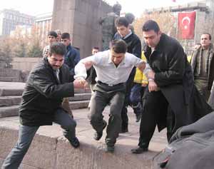 Salih Bekir isimli genç, Kızılay Güvenpark’ta bulunan anıtın önünde elindeki benzini üzerine dökerek kendini yakmak istedi. Böbrek hastası olduğunu iddia eden genç, parasızlık yüzünden diyaliz makinesine bağlanamadığını öne sürdü. Polis ekiplerince etkisiz hale getirilen genç, olay yerinde hazır bekleyen Hızır Acil ambulansı ile Numune Hastanesi’ne götürüldü.