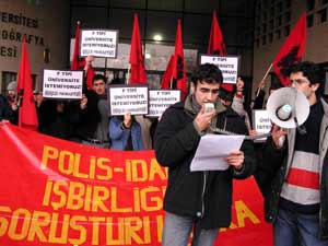 Bir grup Gençlik Federasyonu yanlısı, bazı arkadaşlarına üniversite yönetimi tarafından soruşturma başlatıldığı iddiasıyla eylem yaptı. Ankara Üniversitesi Dil Tarih Coğrafya Fakültesi (DTCF) girişinde toplanan bir grup Gençlik Federasyonu yanlısı öğrenci, "Soruşturmalar derhal geri çekilsin", "Polis idare işbirliğine son", "Soruşturma terörüne son", "F Tipi üniversite istemiyoruz" sloganları attı.