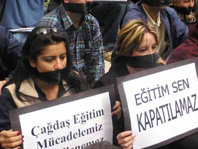 "Eğitim-Sen bu yıl yapılacak olan toplu görüşmelere, daha önceki yıllarda olduğu gibi, eğitim işkolunda yetkili sendika olarak katılacaktır. Toplu görüşme sürecinde öne sürülecek olan başlıca taleplerimiz şunlar olacaktır: ’Çalışma yaşamının demokratikleştirilmesi, grevli, toplu sözleşmeli, özgürlükçü ve demokratik bir sendika yasasının çıkarılması, kamu personel yasa tasarısının geri çekilerek, iş güvenceli, kadrolu çalışma, temel ücretin en düşük dereceli kamu emekçisi için 940 milyon olması, çalışmayan eş için aile yardımının 175 milyona, çocuk yardımının 105 milyona, kira yardımının 221 milyona çıkarılması, her yıl birer maaş tutarında İki ikramiye verilmesi ve haftalık çalışma süresinin 35 saat ile sınırlandırılması’. Milyonlarca yurttaşımızın, çocuklarımızın ve gençlerimizin eşit, parasız, bilimsel eğitim hakkından yoksun bırakılmasına karşı mücadele eden Eğitim Sen’in kapatılmak istenmesine karşı tepkimizi, ağızlarımızı siyah bantla kapatıp, oturma eylemi yaparak gösteriyoruz. Bugün Türkiye genelinde benzeri oturma eylemleri ve basın açıklamaları yapılıyor. Daha sonra ’Parasız Eğitim Hakkımıza Sahip Çıkalım’ başlıklı bildirimizin halka dağıtımını gerçekleştireceğiz".