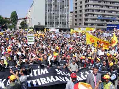 Eğitim- Sen'in kapatılması ile ilgili davanın Ankara Adliyesi'nde başladığı sıralarda Türkiye'nin çeşitli illerinden gelen memurlar Ankara Garı önünde toplanarak mitingin yapılacağı Sıhhiye Meydanı'na yürüdü. Mitinge ÖDP, DEHAP, SDP, TKP gibi partilerin yanısıra DİSK ve çeşitli sendikalar ile sivil toplum kuruluşları destek verdi. Miting alanında duruşmanın sonuçlanmasını bekleyen grup Kürtçe ve Türkçe şarkılar eşliğinde halay çekti. Miting alanındaki bazı grupların bölücü örgüt elebaşı Öcalan lehine slogan attıkları ve fotoğrafını kaldırdıkları görüldü. Duruşmanın sona ermesinin ardından Eğitim-Sen Merkez Yönetim Kurulu üyeleri miting alanına sloganlar eşliğinde geldi.