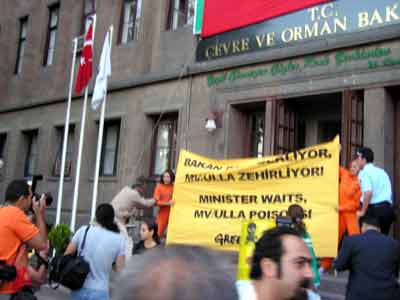 Bakanlığın önünde toplanan Green Peace’ciler, ’Bakan bekliyor, MV Ulla Zehirliyor’ yazılı pankart açtı. Grup, batan geminin dalgıçlar tarafından çekilen su altı fotoğraflarını ellerinde tutarak, getirdikleri varilleri bıraktılar. Eylemcilerin dağılmaması üzerine, polisle grup arasında arbede yaşandı.