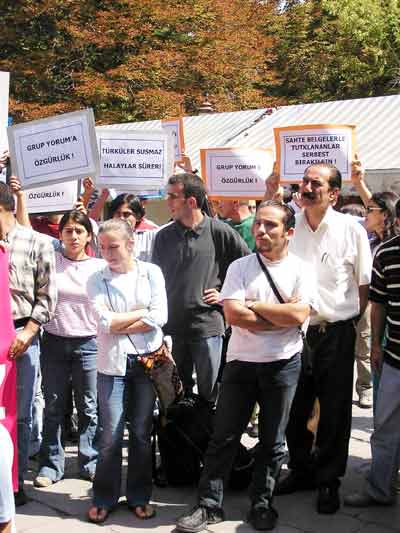 Grup Yorum üyeleri, grup elemanlarından Ali Aracı ve Muharrem Cengiz’in sahte belgeler düzenlenerek tutuklandığını öne sürerek, elemanlarının serbest bırakılması için Adalet Bakanlığı’nın Güvenpark girişinde eylem yaptı.