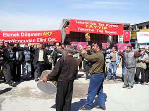 "Tekirimize taş koyma Tayyip, tekerinize taş koyarız", "Ekmek düşmanı AK Parti kamyoncudan elini çek", "Plaka tahdidi istiyoruz" yazılı pankartlar açan kamyoncular, kamyonlarının kontak anahtarlarını yere bırakarak tepkilerini gösterdi. Kamyoncular ve nakliyeciler, ülke genelinde kamyon sayısının çok fazla olduğuna dikkat çekerek, plakaların tahdidini istedi.