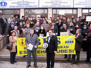 Eskişehir’de, Büro Emekçileri Sendikası Şubesi (BES) üyeleri hükümeti protesto etti. Taşbaşı Vergi Dairesi önünde toplanan yaklaşık 100 kişilik BES üyesi, ellerinde pankart ve dövizlerle slogan attı.