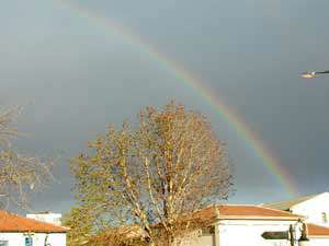 Kısa süren yağmur yağışının ardından şehir merkezi üzerinde oluşan gökkuşağı, rengarenk görüntüsüyle vatandaşların dikkatini çekti.