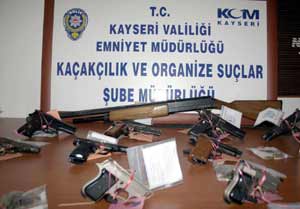 Edinilen bilgiye göre, aldıkları bir istihbaratı değerlendiren Kayseri Emniyet Müdürlüğü Kaçakçılık ve Organize Suçlar Şube Müdürlüğüne bağlı ekipler, Bektaş Y., Feyat Ö., Ramazan T., Seyfettin T., Davut K., Musa G., Mehmet A., Mustafa D., Kadir S., Yaşar İ., Mehmet Y., Muhammet Ö., İbrahim T., Mustafa T., Seyit Ş. ve Mehmet Ş. adlı şahısların ev ve işyerlerinde yaptıkları aramalarda, 17 adet ruhsatsız tabanca ile 1adet av tüfeği ve bunlara ait çok sayıda mermi ele geçirdi.