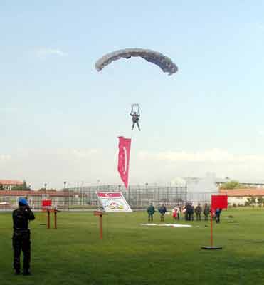Daha sonra 1. Komando Tugayı’na mensup askerler, askeri bando eşliğinde geçit töreni yaparken, askerlerin nefes kesen paraşüt gösterileri davetlilerden büyük alkış aldı.