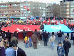 Temsili maket yakan ülkücülerin bayrağa saygı mitingine, Sağlık eski Bakanı Osman Durmuş ve eski Kırıkkale Belediye Başkanı Mustafa Pekdoğan da katıldı. Polisin geniş güvenlik önlemleri aldığı yürüyüşte ülkücüler, "Bayrak inmez vatan bölünmez, bayrağa uzanan eller kırılır" şeklinde slogan attı.