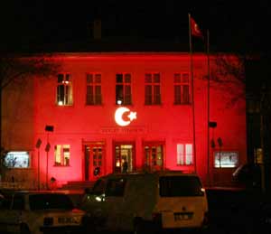 Türk bayrağına yapılan saldırıya tepkiler sürerken, Konya Devlet Tiyatrosu binasına projektörlerle yansıtılan ay yıldız ve kırmızı ışıklarla oluşturulan bayrak ilginç bir görüntü oluşturdu.