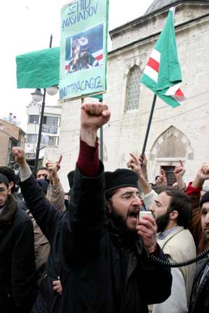 Öldürülen Çeçen lider Aslan Mashadov için Konyada iki ayrı camide gıyabi cenaze namazı kılındı. Namaz sonrası bir grup, sloganlar atarak Rus bayrağını ateşe verdi.