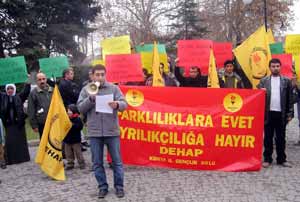 DEHAP Gençlik Kolları Merkez Başkanı Erkan Kotay, Kayalıpark’ta yaptığı basın açıklamasında, Cumhuriyet’in kurucularından olan Kürtler’in bugün dışlandığını ve hiçe sayıldığını belirterek, bunların demokratikleşme sürecinde Cumhuriyet’e kan kaybettirdiğini söyledi.