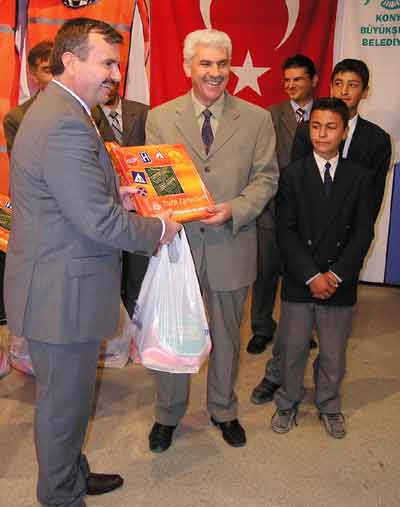 Konuşmaların ardından Konya Büyükşehir Belediye Başkanı Tahir Akyürek okulları temsilen 10 okul müdürü ve öğrencilerine trafik eğitim setini dağıttı. 200 okula dağıtılacak bu sette 2 öğrenci yeleği, 2 adet öğrenci trafik yağmurluğu, 1’er adet öğretmen yeleği ve yağmurluğu, 3 adet trafik şapkası, 2 el lambası, 3 adet dur geç levhası, 3 adet düdük ve sınıflar için birer adet trafik eğitim seti bulunuyor.