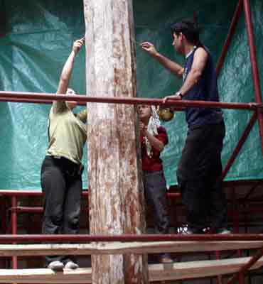 Restore çalışmaları kapsamında camii içerisinde bulunan ahşap sütunlarda ince işlerde görev alan öğrenci kızlar, yüksekliğe aldırış etmeden korkusuzca temizleme çalışması yapıyor. Yaz tatilini fırsat bilip bu işlerde çalıştıklarını belirten öğrenci kızlar, yaptıkları işle harçlıklarını çıkarmanın yanı sıra, aile bütçesine de katkı sağladıklarını belirtiyorlar.