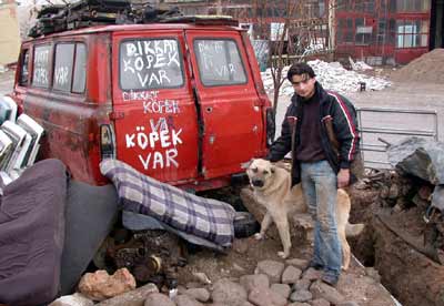 Sanayi Sitesi 1. Sokakta oto kaportacılığı yapan Nurullah Sümerin işyerinin önünde bulunan minibüsün üzerinde "dikkat köpek var" uyarısını görenler şaşkınlığını gizleyemiyor.