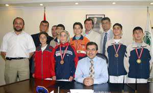 Meram Belediye Başkanı Refik Tuzcuoğlu, tekvando şampiyonalarında madalya kazanan Meram Belediyesporlu sporcuları altınla ödüllendirdi.