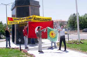 Bu dövizlerin önüne bir de Türk Bayrağı açan gençler, terör örgütü aleyhine sloganlar attı. Gençler daha sonra yanlarında getirdikleri terör örgütü PKKnın sözde bayrağını, üzerine benzin dökerek ateşe verdi. Bu eylemi hiçbir siyasi görüş ya da misyon adına yapmadıklarını belirten gençler, amaçlarının devletin resmi ambulansına PKK bayrağı asılmasını protesto etmek olduğunu ifade ederek, PKK sempatizanlarının gösterilerine müdahalede yetersiz kalındığını ileri sürdü.