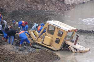 Bu arada olay yerine toplanan yaklaşık 300 kadar meraklı vatandaş, işçilerin çalışmalarını büyük ölçüde aksatırken, daha sonra kurtarma çalışmalarına katılan 4 iş makinesi sayesinde balçık içerisindeki dozer çıkartılabildi.