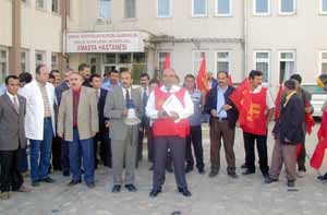 DİSK Genel-İş Sendikası Amasya Şubesi, SSK Hastanesi önünde bir basın açıklaması yaparak, SSK Hastaneleri’nin Sağlık Bakanlığı bünyesine alınmasına tepki gösterdiler.