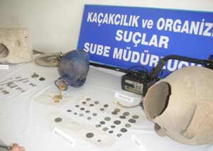 Ahmet Kale ve Refik Gülümün evlerinde yapılan arama da, 32 adet değişik ebatta madeni sikke, 2 adet cak kapak, 4 adet madeni okucu, 1 adet taş, testi, küp ve kurşun mühür ile 6 adet değişik tip ve boyutta madeni obje ve altın para aramada kullanılan dedektör ele geçirildi.