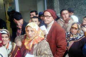 Annesi Kezban Altunbasan (64) ile kuyrukta bekleyen Ömer Altunbasan (18) ise, çoğu yaşlı ve hasta olan ihtiyaç sahiplerinin 2 gündür bankanın önünde bekletildiğini ifade ederek, "100 YTL için bizi 2 gündür bekletiyorlar. Biz de insan muamelesi görmek istiyoruz" şeklinde konuştu.