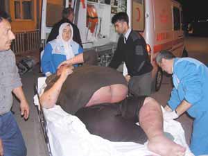 Bolu’nun Banaz Köyü’nde yaşayan 2 çocuk babası Mustafa Özaçar (33), kiloları nedeniyle hastalanınca, Bolu İzzet Baysal Devlet Hastanesi’ne kaldırılarak tedavi altına alındı. Buradaki tedavisinin ardından bu sabah İstanbul SSK Okmeydanı Hastanesi’ne sevkine karar verilen Mustafa Özaçar, yattığı servisten ambulansa kadar 10 kişinin yardımıyla 1 saatte götürülebildi. Normal sedyeye sığmayan Özaçar, yatağa yatırılarak güçlükle hastaneden çıkarıldı. Özaçar, hastaneden çıkarılışı sırasında ise gözyaşlarına hakim olamadı.