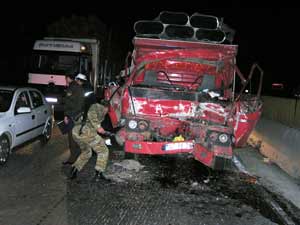 Bolu Dağının Düzce Darıyeri Hasanbey mevkiinde dün gece meydana gelen kazada, Ankaradan İstanbula gitmekte olan Zülküf Karaağaç (26), idaresindeki 34 YB 293 plakalı kamyon ile aşırı hız ve dikkatsizlik nedeniyle önünde seyreden Sezgin Şahin idaresindeki 67 NN 101 plakalı kamyona çarptı.