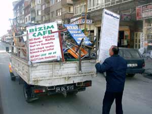 Bolu Belediyesi Zabıta Müdürlüğü ekipleri bugün yaptıkları bir operasyonla, kentin ana caddesi olan İzzet Baysal Caddesi çevresindeki kaldırımlarda bulunan tabelaları sorgusuz sualsiz topladı.