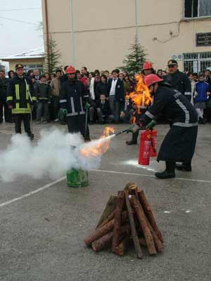 Okul bahçesinde kalabalık bir öğrenci grubuna açıklamalarda bulunan Bolu Belediyesi İtfaiye Müdürü Erol Yavuz, insanlar tarafından müdahale edilemeyen ateşin yangın olduğunu söyleyerek, öğrencilerden yangın konusunda bilgili olmalarını ve yangın esnasında asla paniğe kapılmamalarını istedi.