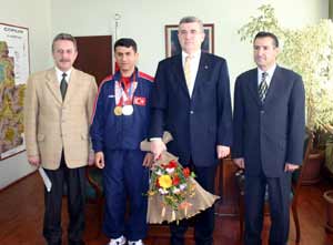Şampiyon sporcu İsmail Kuruçay, Milli Eğitim Müdürü Aziz Yavaş ile Çorum Valisi Hüseyin Poroyu ziyaret etti.