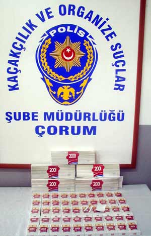Çorum Emniyet Müdürlüğü Kaçakçılık ve Organize Suçlar Şube Müdürlüğü ekipleri tarafından düzenlenen bir operasyonda, 50 paket sahte Tekel 2001 sigarası ele geçirildi.
