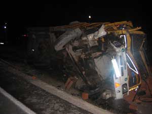 Edinilen bilgiye göre, dün gece saat 23.00de Sungurlu-Ankara Karayolunun 7inci kilometresinde Cemal Boranın (39) kullandığı 19 A P 578 plakalı, tuğla yüklü kamyon, Abdullah Uyumaz (35) yönetimindeki 61 K 2157 plakalı TIRı sollamak isterken, şarampole yuvarlandı. Sürücüsünün direksiyon hakimiyetini kaybetmesi nedeniyle TIR da şarampole yuvarlandı.