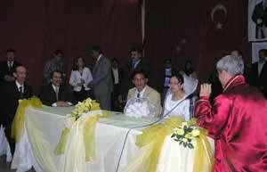 Daha sonra Düzce Belediyesi nikah memuru Akif Çodur, çiftlerin nikahını kıyarken, Vali Halil Nimetoğlu ile TSO Başkanı Metin Büyük de nikah şahitliği yaptı. Törende ilk nikah, 1.5 yıl önce dini nikahla evlenen ve Emrah isimli 8 aylık çocukları olan Asiye Coşkun (18) ile Ercan Birinci çiftine kıyıldı. Törende tüm çiftlere TSO tarafından birer çeyrek altın hediye edildi.