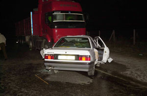 Düzce'nin Akçakoca İlçesi'nde bir TIR'ın altına giren otomobilde bulunan 6 kişi öldü. Akçakoca'dan Düzce istikametine seyreden ve sürücüsü henüz belirlenemeyen 81 GA 247 plakalı özel otomobil, Dadalı Köyü yakınlarında, karşı yönden gelen ve sürücüsü henüz tespit edilemeyen 34 AU 4917 plakalı TIR'ın altına girdi.