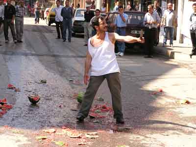 Cemal Gürsel Caddesi üzerinde manavlık yapan Kerim Keser (38), bugün sabah saatlerinde eline bıçak alarak cadde ortasında kendisini kesmeye ve karpuzları sokak ortasına atarak parçalamaya başladı. Bıçakla vücudunu çizen Keser, bu sırada elindeki bıçağı copla vurarak düşürmek isteyen bir polis memuruna saldırdı. Keser’i ikna etmek için polis ve arkadaşları uzun süre çaba harcarken, bir anlık dalgınlığından yararlanan bir polis ve arkadaşları Keser’i etkisiz hale getirerek elindeki bıçağı aldılar. Polis aracına yaklaşık 6 kişinin zor bindirdiği Keser, daha sonra Giresun Emniyet Müdürlüğü’ne götürüldü