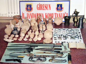Edinilen bilgiye göre, İl Jandarma Komutanlığı Kaçakçılık ve Organize Suçlarla Mücadele ekipleri tarafından, Çıtlakkale Mahallesi’nde Adem Esen’e (60) ait evde yapılan aramalarda, 10 adet Roma dönemine ait pişmiş toprak testi, 19 adet Roma dönemine ait pişmiş toprak çanak, 4 adet Roma dönemine ait göz yaşı şişesi, 11 adet Roma dönemine ait pişmiş toprak şamdan, 32 adet Urartu dönemine ait bronz bileklik, 13 adet çeşitli dönemlere ait sikke, 1 adet mızrak ucu, 3 adet toprak hayvan figürü, 1 adet yelpaze, 1 adet ağızlık, 4 adet çeşitli boylarda kılıç, 12 adet kama, 81 adet beylik hançeri, 1 adet gümüş kemer, 1 adet sarı madeni alınlık, 1 adet tüfek süngüsü, 1 adet gümüş işlemeli taşlı gerdanlık, 1 adet kilise çanı, 1 adet gümüş bileklik, 4 adet madeni toka, 1 adet el yazmalı kitap, 1 adet bronz hayvan fiğürü, 1 adet cam göz yaşı kabı, 1 adet sarı inogalı kolye, 1 adet kulplu şarap kabı, 1 adet sarı renkli ibrik, 1 adet madeni kuş kafası olmak üzere toplam 209 adet tarihi eser ele geçirildi.