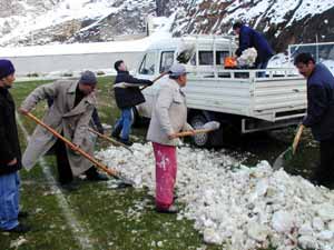 Gençlik ve Spor İl Müdürü Osman Turan, karla kaplı olan sahanın büyük bir bölümünün Gümüşhane Lisesi pansiyonunda kalan öğrenciler tarafından temizlendiğini, ancak sahanın temizliğinin yetiştirilemediğini söyledi.