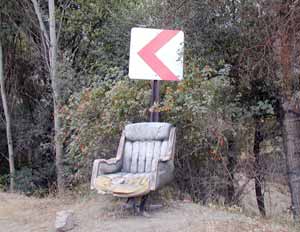 Gümüşhane’de, Karayolları Bölge Müdürlüğü’nce konulan yol işaret levhasının altındaki eskimiş makam koltuğu görenlerin dikkatini çekiyor.