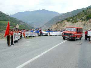 Kürtün İlçesi Jandarma Komutanlığı Trafik Timlerinin ve öğretmenlerinin kontrolünde Gümüşhane-Tirebolu Karayolunun 40. kilometresinde trafik kontrolü yapan Karaçukur Köyü 80nci Yıl İlköğretim Okulu öğrencileri, sürücülere çikolata ve kolonya ikram ederek, trafikle ilgili broşür dağıttı.