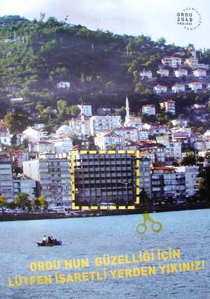 "2005 yılına girildiği halde hala bitirilemeyen bu bina, şehrin en merkezi yerinde adeta karabasan gibi şehrin silueti üzerine çökmüş, görüntü ve imar kirliliği oluşturan bir hal almıştır. Estetik açıdan çok çirkin bir görüntüye sahip olan bu bina, kendi haline terkedilmiştir. 3194 sayılı İmar Kanununun 29. madde hükümlerine göre binanın ruhsat yenilenmesi yapılması yasal zorunluluktur. Bu işleme tabi tutulmayan binaların ruhsatlarının hükümsüz kalacağı ve ruhsatsız yapı hükmünde olacağı bilinen bir gerçektir. Şehrin estetik görüntüsü ile birinci dereceden sorumlu ve yön verici olması gereken Belediyemizin bu duruma sessiz ve seyirci kalması düşünülemez. Artık kaçak yapı statüsüne düşmüş yapı ile ilgili olarak Belediyemizi göreve davet etmek durumundayız. Tarihi Taşbaşı evlerinin güzel görünümünü çirkin ve estetikten uzak kaba görüntüsüyle tamamen kapatan, hükümsüz yapı ruhsatı ile yıllardır şehrin göbeğinde yeşil ile mavinin arasında kaçak olarak anlamsız ve çirkin varlığını sürdüren, şehrimizin bu çirkinliğe katlanmasını gerektiren herhangi bir müspet fonksiyonda getirmeyen yapıyı artık şehrimizde görmek istemiyoruz. Afişte belirttiğimiz gibi Ordunun güzelliği için lütfen işaretli yerden yıkınız."