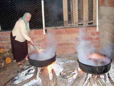 "Ağaçlardan toplanan elmalar tek tek doğranarak naylon bir çuval içersinde suyu çıkartılıyor. Daha sonra kazanlara doldurulan elma suları odun ateşinde kaynatılıyor. Saatlerce kaynayan elma suyu, gece yarısına doğru pekmez olarak kaplara aktarılıyor."