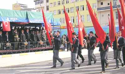 Ardından Rize Valisi Enver Salihoğlu, Rize Belediye Başkanı Halil Bakırcı ve Jandarma Alay Komutanı Jandarma Albay Mehmet Ruhi Candan, törene katılanların bayramını kutladılar. Törende konuşan Rize Valisi Enver Salihoğlu, büyük liderlerin zor zamanlarda çıktığını hatırlatarak, kurtuluş mücadelesinin Türk milletine Atatürk gibi büyük bir önderi kazandırdığını söyledi. Halk oyunları ekiplerinin gösterilerinin ardından tören, resmi geçitle sona erdi.