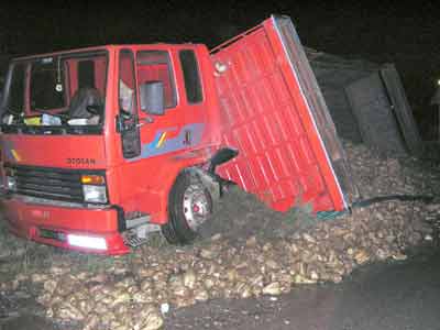 Ahmet Yıldırım yönetimindeki 55 K 5206 plakalı şeker pancarı yüklü kamyon, sürücünün direksiyon hakimiyetini kaybetmesi sonucu yoldan çıkarak karşı şeride geçmek üzereyken refüj ortasında şaseden kurtulan kamyon kasası devrildi.