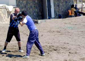 Boks eğitimi alan gençler denizin ve kumun da keyfini çıkarıyor. Şu anda Sinop'ta 150 lisanslı boksör olduğunu belirten Boks Antrenörü Özcan Mayoğlu, yaz sezonunda da 10'u bayan 40 aktif sporcu ile kursları sürdürdüklerini söyledi.
