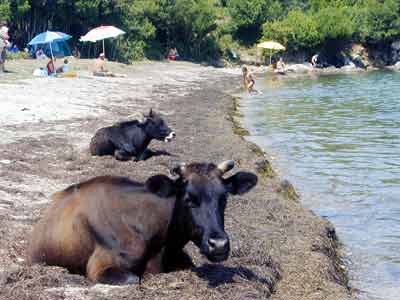 Hafta boyunca etkisini sürdüren sıcak hava Sinop’ta 39 dereceyi buldu. Sıcaklardan bunalan vatandaşlar serinlemek için plajları doldururken, bir çok inek de Akliman mevkiinde sahile indi. İnekler, yerli ve yabancı turistlerin serinlemek için tercih ettiği kumsalda insanlarla iç içe denizin ve kumun tadını çıkarttı.