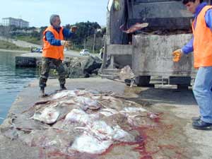 Daha sonra vatoz balıkları belediye ekipleri tarafından çöp arabasına yüklenerek kaldırıldı.