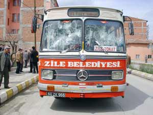 Tokatın Zile İlçesi ile Tokat arası sefere başlayan Zile Belediyesine ait otobüs, ilk seferinde Turhallı dolmuşçuların saldırısına uğradı.